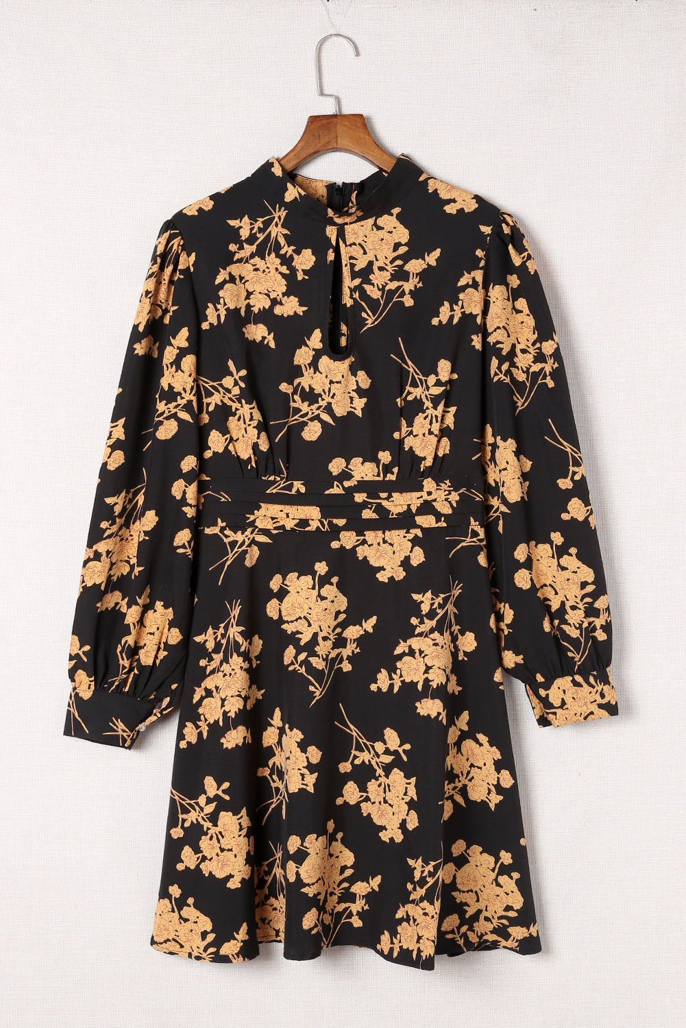 •Featured with key-hole neckline, long sleeves, high waist, mini length, and floral pattern