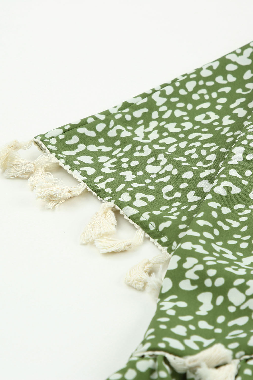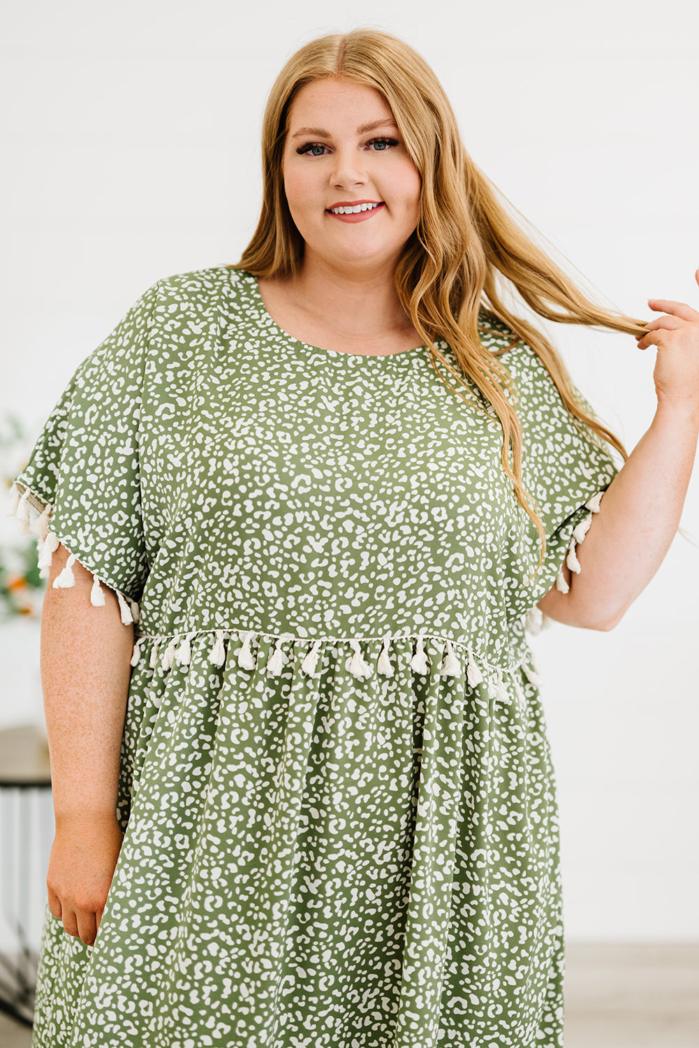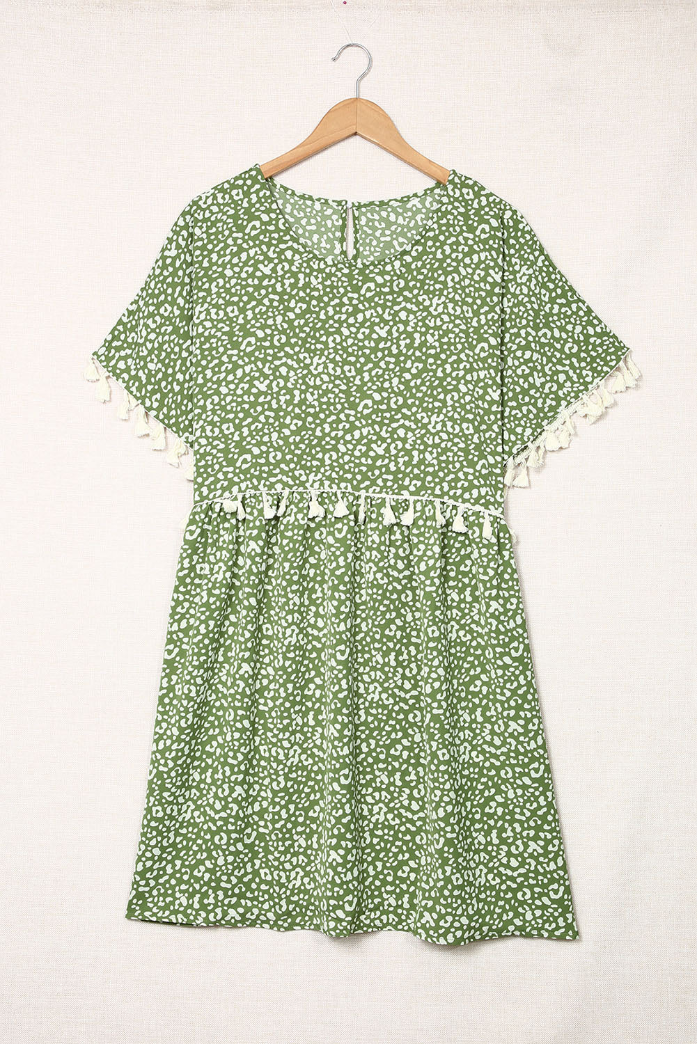 This plus size dress features a round neckline, leopard print, tassel detailing, and a babydoll fit